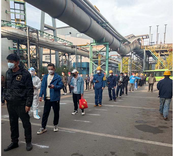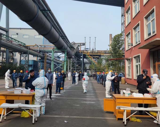 “核酸檢測人員,自覺保持2米距離、戴好口罩”10月12日上午,在公司綜合樓門前,行政處、分廠安全員、核算員積極協(xié)調核酸檢測現(xiàn)場秩序,在配合醫(yī)護人員開展檢測工作的同時,做好防疫宣傳工作。前來進行核酸檢測的職工在現(xiàn)場排起長龍,積極配合工作人員的指揮。