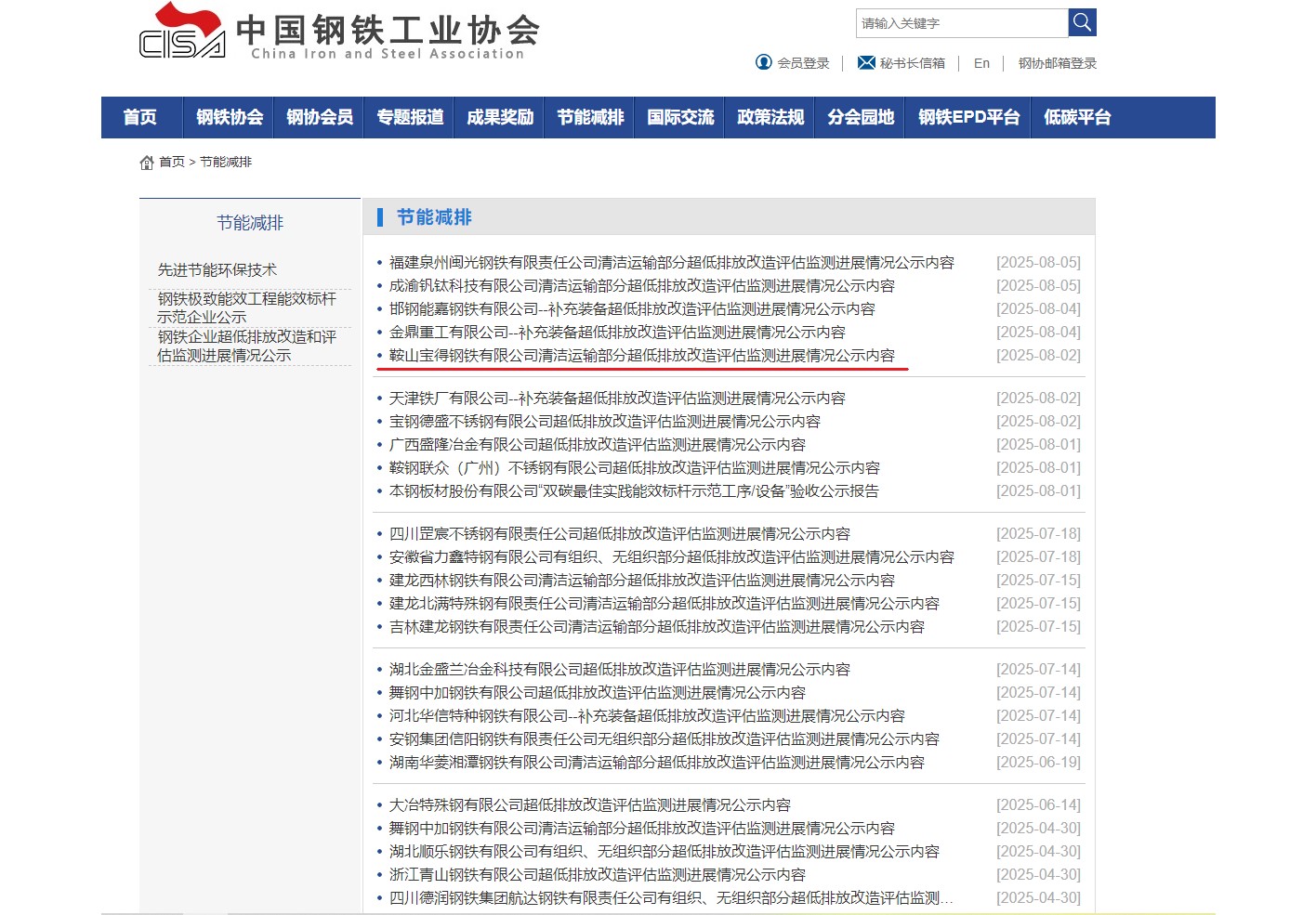 2025年8月2日,中國鋼鐵工業(yè)協(xié)會(huì)對(duì)鞍山寶得鋼鐵有限公司超低排放清潔運(yùn)輸改造和評(píng)估監(jiān)測情況進(jìn)行了公示,寶得鋼鐵有限公司成為鞍山市除鞍鋼外首個(gè)完成超低排放清潔運(yùn)輸改造和評(píng)估監(jiān)測工作的企業(yè),標(biāo)志著公司超低排放改造項(xiàng)目取得重要階段性成果。不僅為企業(yè)可持續(xù)發(fā)展奠定了堅(jiān)實(shí)基礎(chǔ),也為鞍山地區(qū)的環(huán)境保護(hù)作出了積極貢獻(xiàn),是企業(yè)履行社會(huì)責(zé)任的生動(dòng)實(shí)踐。